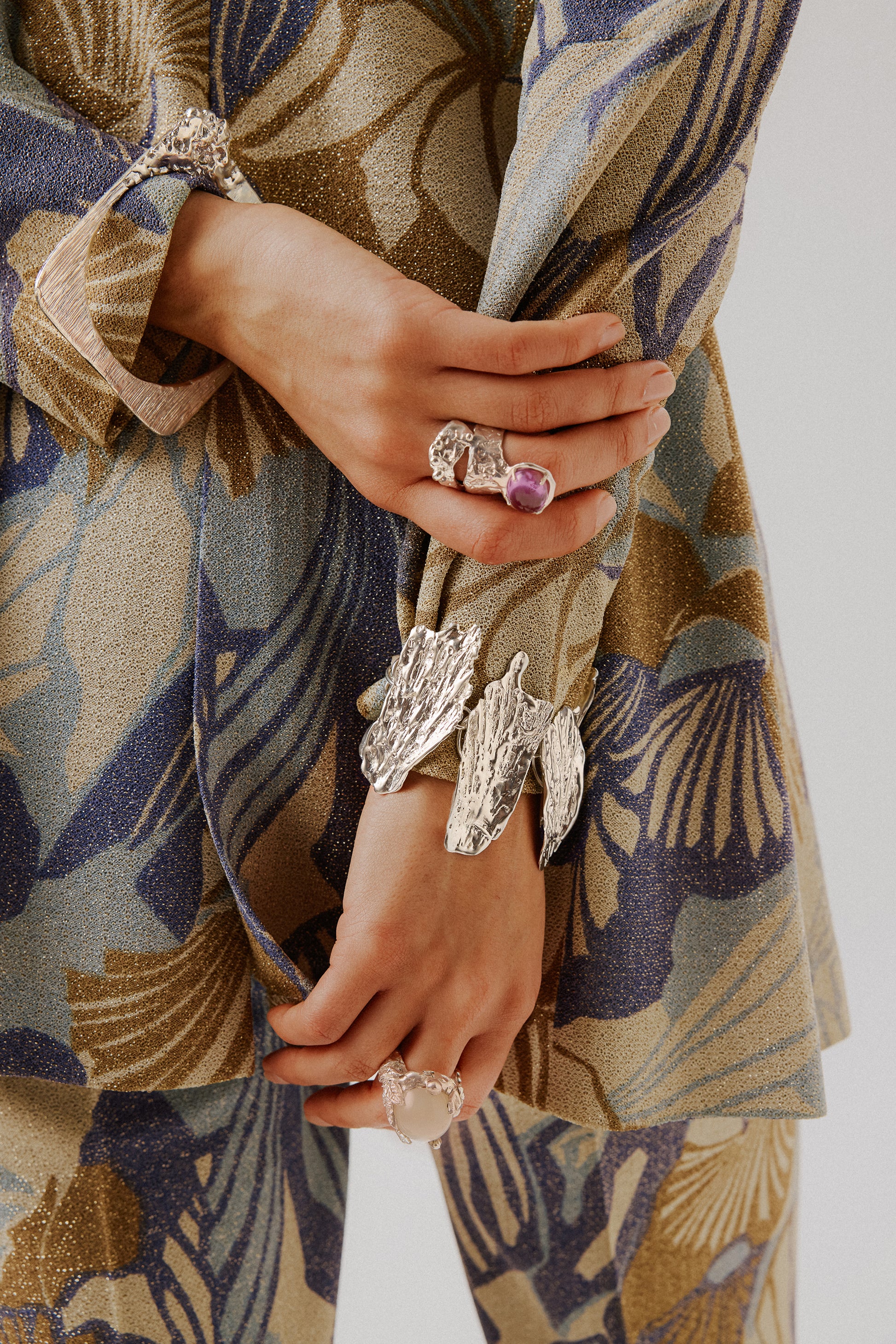 Bu spesifik parça tasarımcımızın çocukluğunda kumsalda geçirdiği zamanlara göz kırpıyor. 'Shore' bileklik, o dönemde kumsalda keşfettiği ve zihninde kalan ganimetlerin dokularından esinlenerek seneler sonra mumda tekrardan el ile şekillendirildi.